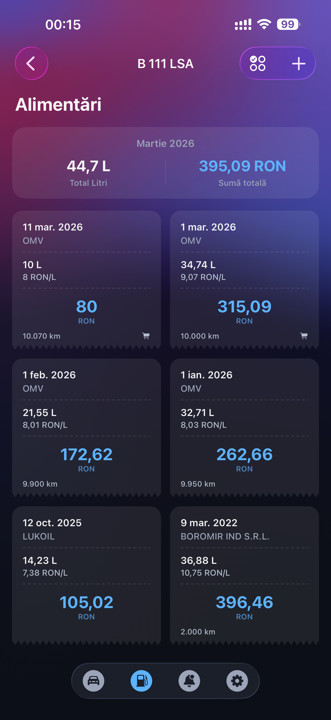 Deasupra grid-ului stă un sumar al lunii curente ce contine total litri, total cost, într-un card glassmorphism cu fundal semi-transparent. E un dashboard minimal care răspunde la întrebarea "cât am cheltuit luna asta?" fără să deschizi nimic.