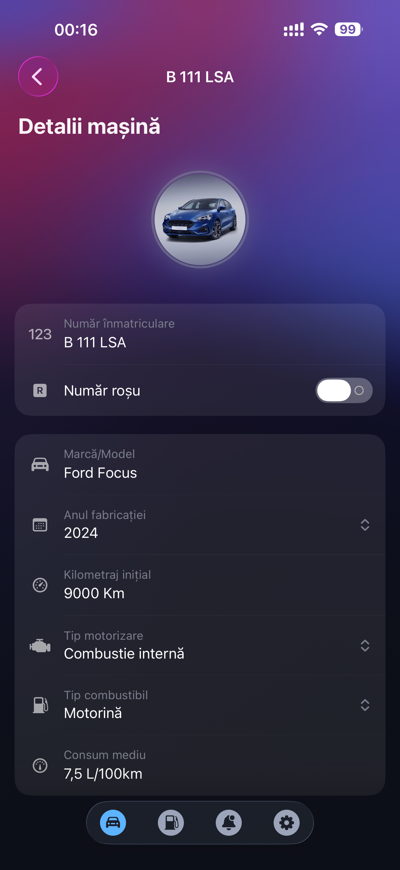 Cardul de mașină are propria identitate, am vrut ceva simplu și util. Fiecare mașină se prezintă cu numărul de înmatriculare prominent, marca și modelul și tipul de combustibil.