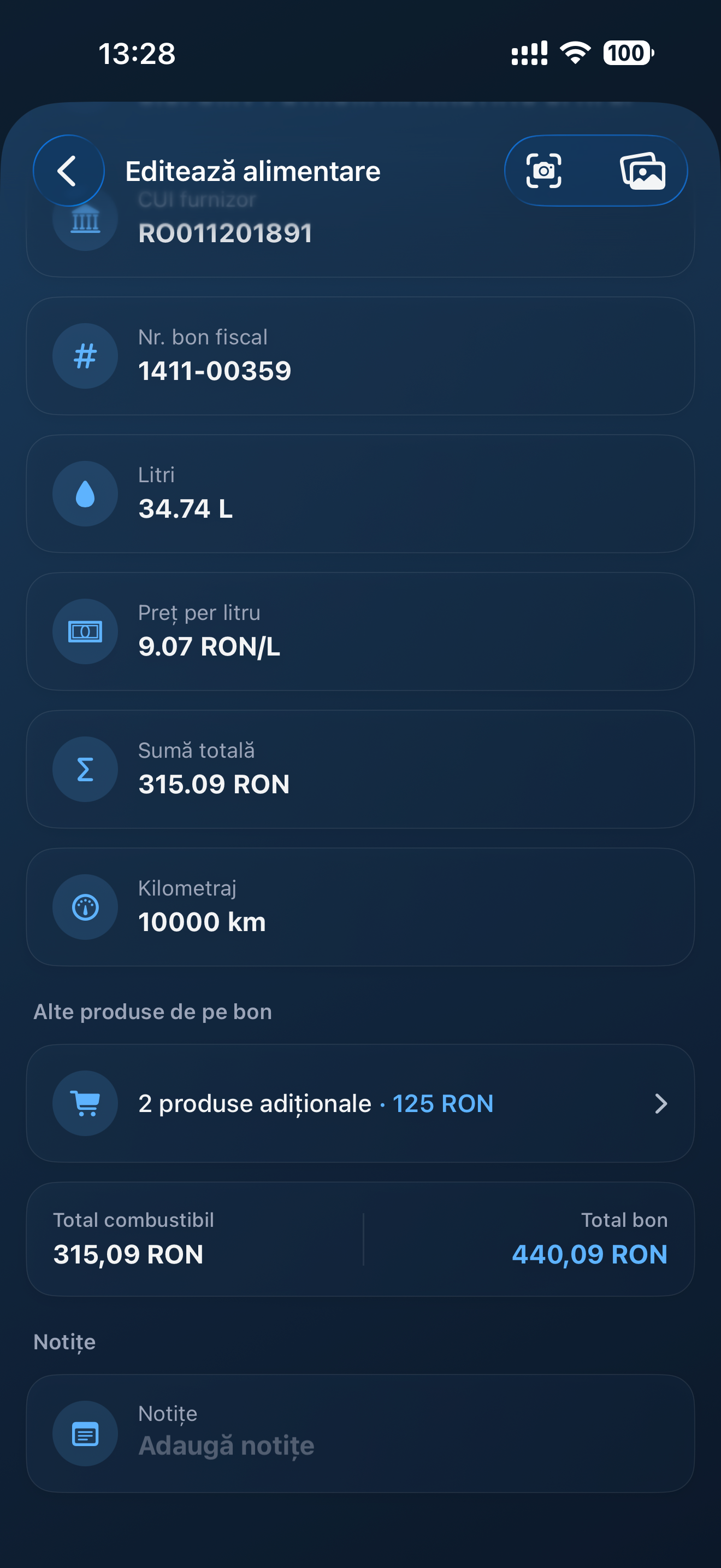 Două totaluri sunt mai bune decât unul. Tentația inițială a fost să am un singur total per bon. Dar combustibilul și cafeaua sunt categorii complet diferite din punct de vedere contabil și din punct de vedere al analizei de consum. Separarea lor din start a simplificat totul, fiecare parte a aplicației ia ce are nevoie fără calcule suplimentare.