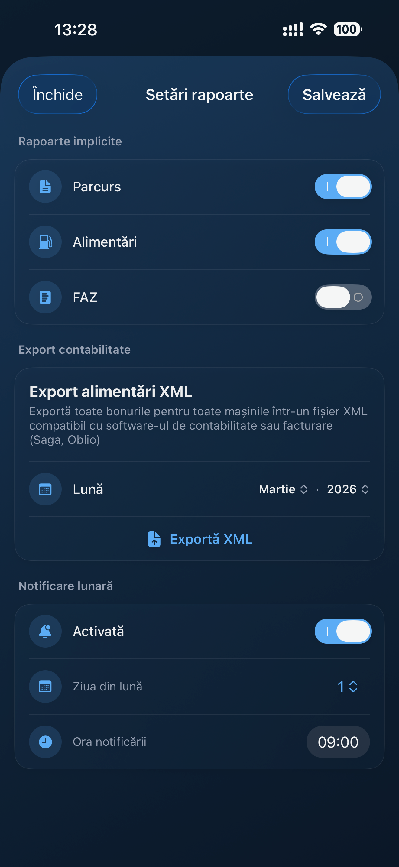 Exportul XML e simplu: selectezi luna, apeși „Exportă XML", primești fișierul prin Share Sheet. Toate alimentările de pe toate mașinile, într-un singur fișier. Contabilul importă o dată și gata.
