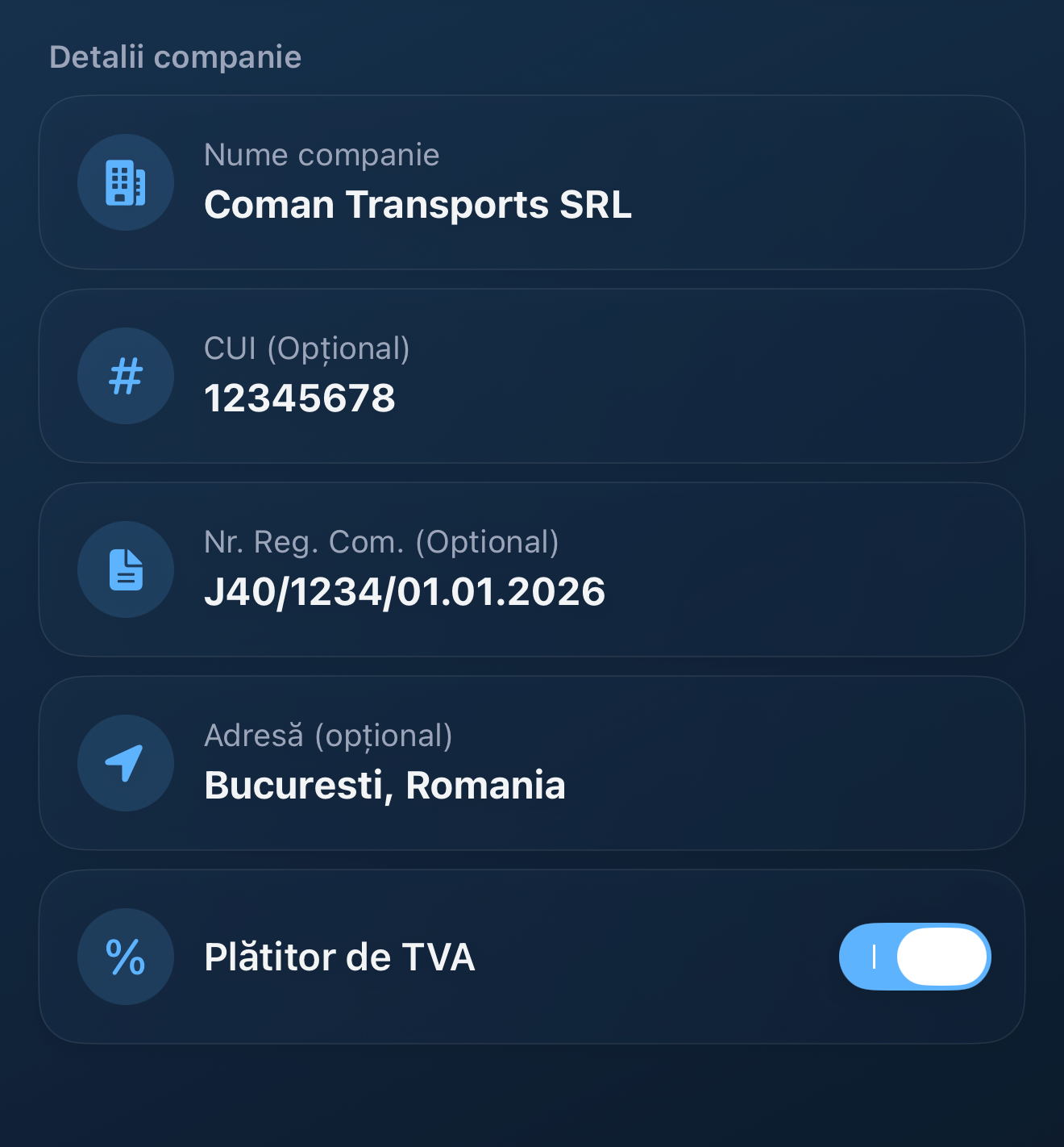 Am adăugat un comutator „Plătitor de TVA" pe ecranul de editare companie. Dacă e activat, exportul calculează și include TVA-ul. Dacă nu, TVA-ul e zero pe toate liniile. Un singur comutator care schimbă complet structura financiară a exportului.