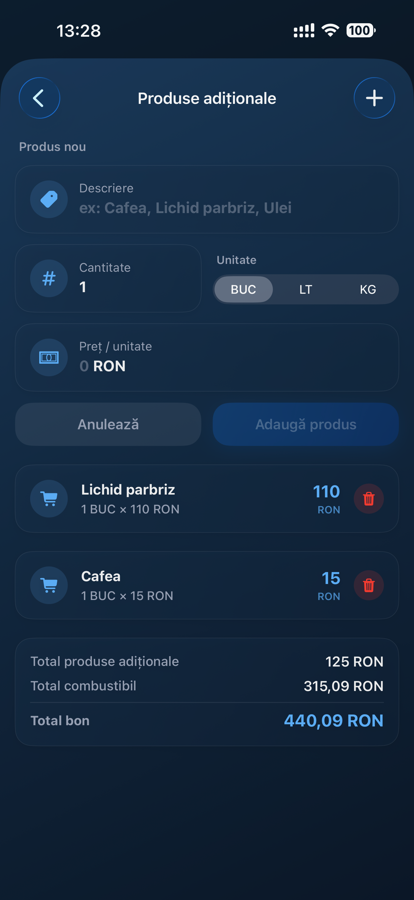 Am creat un model nou, ReceiptItem, legat de alimentare prin relație SwiftData. Pe ecranul de alimentare, sub câmpurile de combustibil, am adăugat un NavigationLink către un ecran de „Produse adiționale". Cine nu cumpără nimic extra nu vede nimic extra. Cine cumpără, adaugă produsele, și bonul devine complet.