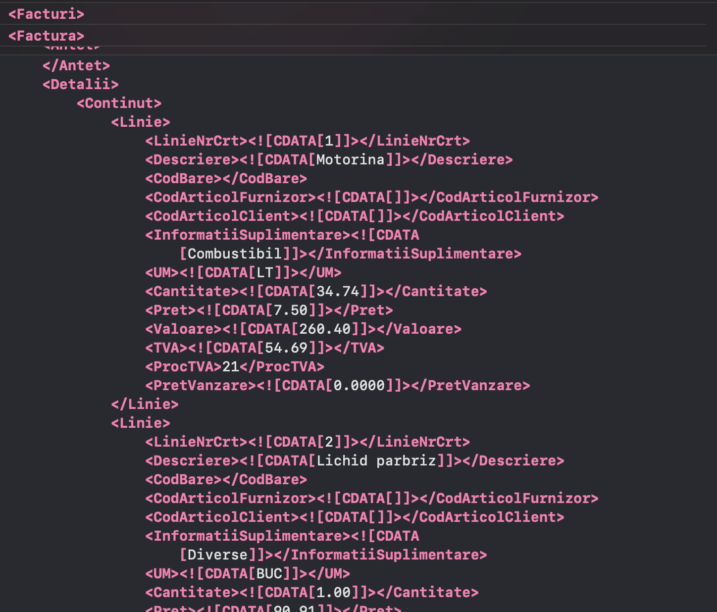 Fiecare bon de combustibil devine o „factură" de tip C (bon fiscal cu CUI) în limbajul contabilității. Structura XML are un antet cu datele furnizorului (benzinăria) și ale clientului (firma), linii de detaliu cu produsele (combustibilul plus orice altceva e pe bon), și un sumar cu totalurile.